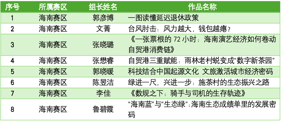 自第十届中国数据新闻大赛暨首届AIGC应用大赛海南赛区有效作品征集启动以来,大赛得到了全省新闻传播类、艺术类院校师生及业界同行的关注与支持。经过海南省赛区组委会的初审核查,共有8组数据新闻作品、7组AIGC应用作品入围(排名不分先后),现予以公示。