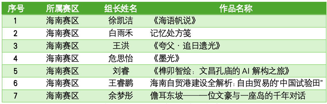对以上名单和后续相关事宜如有疑问,请联系赛区组委会。海南省赛区组委会将组织专家对入围作品进行评审,预计9月下旬公布决赛名单。