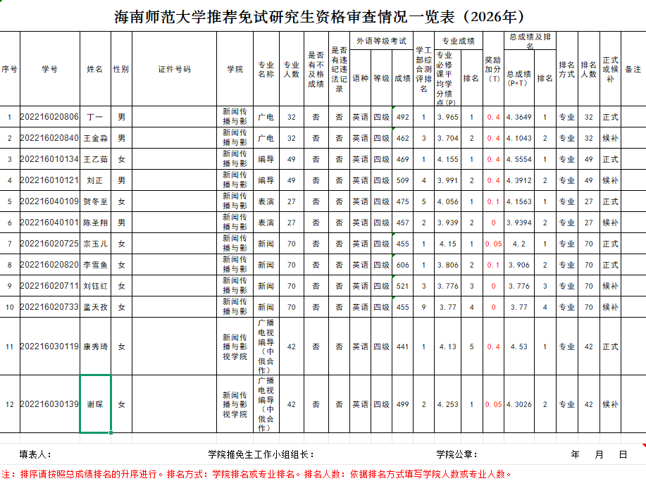附:海南师范大学新闻传播与影视学院推荐免试研究生资格审查情况一览表(2026年)