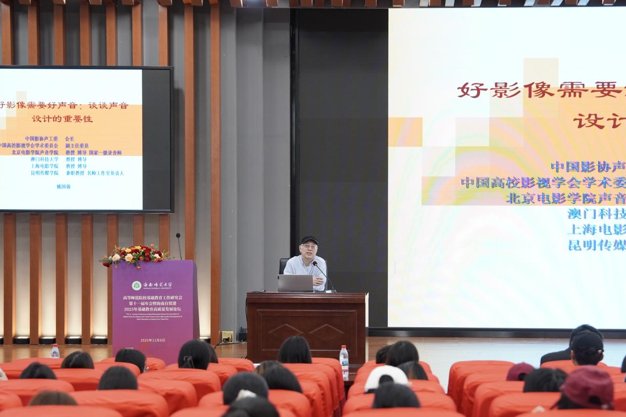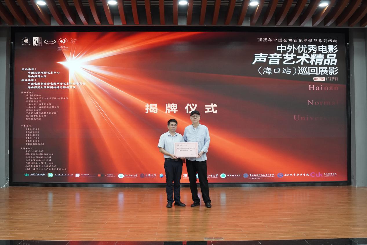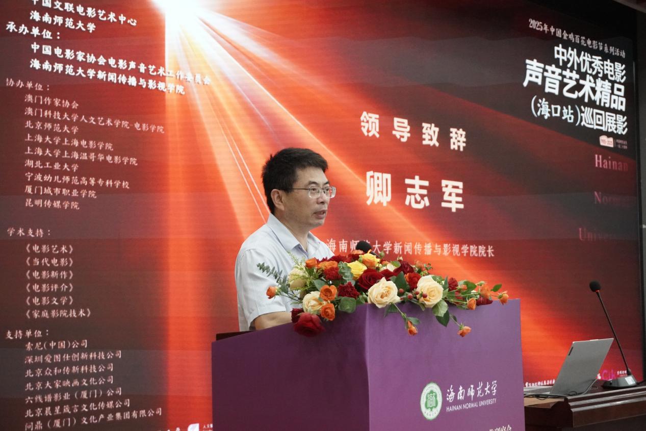 开幕仪式上,卿志军院长与姚国强教授先后登台致辞。卿志军院长在致辞中表示:“今天,我们相聚海南师范大学,共同见证‘2025年中国金鸡百花电影节系列活动——中外优秀电影声音艺术精品(海口站)巡回展影’盛大启幕。这不仅是一场电影声音的艺术盛宴,更是思想与灵感的碰撞,是汇聚学术、创作与教育力量的文化盛会。”姚国强教授则展望道:“我们期待通过此次高层次学术交流,推动电影声音艺术与影视动画设计、AIGC技术、数字媒体等领域深度融合,为青年学子搭建更广阔的专业视野与创作平台。”